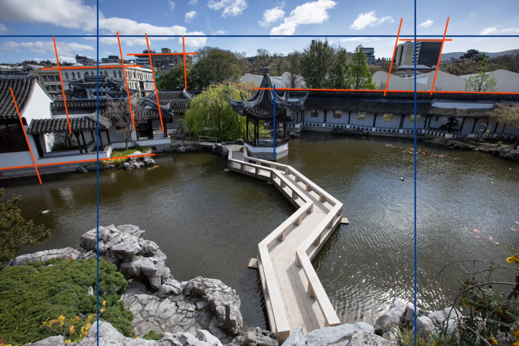The buildings in this shot that surround the Dunedin Chinese Gardens are meant to stand upright, proud, and square. But because of the lens, the height and the angle the camera lens did what it does best: it lied.